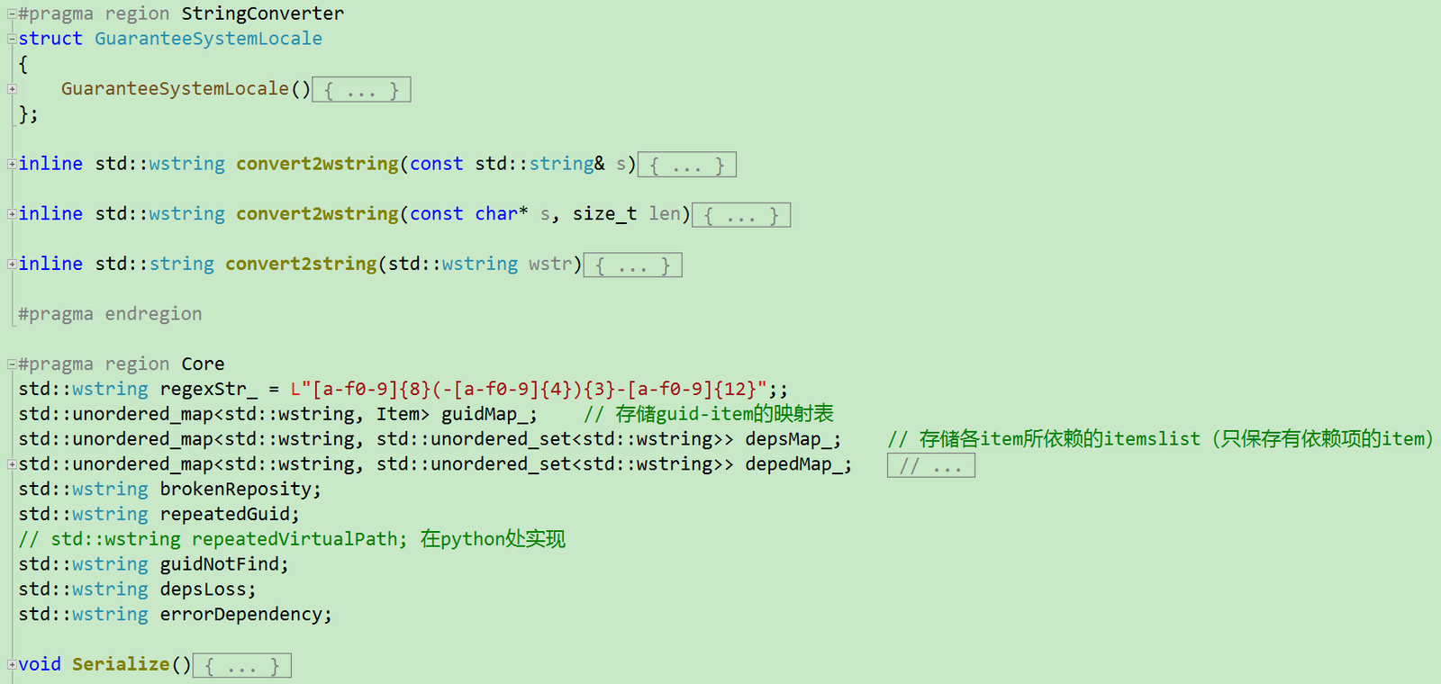#pragma once#include <pugixml.hpp>#include <experimental/filesystem>#ifdef DLL_EXPORT#define DLL_API extern "C" __declspec( dllexport )#else#define DLL_API extern "C" __declspec( dllimport )#endifDLL_API void __stdcall Launch(std::wstring inputPath);DLL_API std::wstring __stdcall GetNextVirtualPath();DLL_API std::wstring __stdcall GetDeps(std::wstring guidKey);DLL_API std::wstring __stdcall GetDeped(std::wstring guidKey);DLL_API const wchar_t* __stdcall GetBrokenReposity();DLL_API const wchar_t* __stdcall GetRepeatedGuid();DLL_API const wchar_t* __stdcall GetGuidNotFind();DLL_API const wchar_t* __stdcall GetDepsLoss();DLL_API const wchar_t* __stdcall GetErrorDependency();DLL_API int __stdcall ModifyDepsGuid(std::wstring itemGuid, std::wstring srcGuid, std::wstring destGuid);struct Item{public:std::wstring Type;std::wstring GUID;std::wstring Package;std::wstring Class;std::unordered_set<std::wstring> Deps;std::wstring Name;std::experimental::filesystem::path RepositoryPath;Item(){Type = L"";GUID = L"";Package = L"";Class = L"";Name = L"";}Item(std::wstring type, std::wstring guid, std::wstring package,std::unordered_set<std::wstring> deps, std::wstring name) : Type(type),GUID(guid), Package(package), Deps(deps), Name(name) { }Item(std::wstring type, std::wstring guid, std::wstring package, std::wstring cls, std::unordered_set<std::wstring> deps, std::wstring name, std::experimental::filesystem::path repositoryPath) : Type(type),GUID(guid), Package(package), Class(cls), Deps(deps), Name(name), RepositoryPath(repositoryPath) { }};
