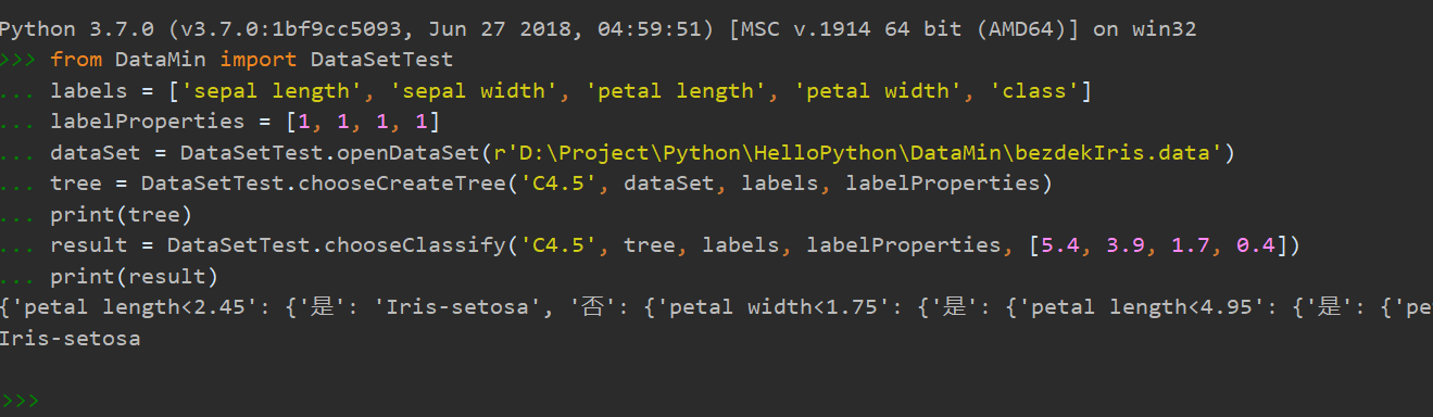result = DataSetTest.chooseClassify('C4.5', tree, labels, labelProperties, [5.4, 3.9, 1.7, 0.4])