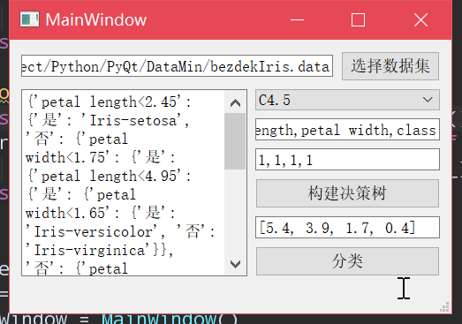 本次数据挖掘大作业,我完成了包含ID3和C4.5两个分类算法的软件系统,并用该系统完成了急性炎症和鸢尾花两个数据集的解析,最后测试的分类结果也都是正确的。