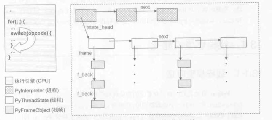 在通常情况下,Python只有一个interpreter,这个interpreter中维护了一个或多个的PyThreadState对象,与这些PyThreadState对象对应的线程轮流使用一个字节码执行引擎