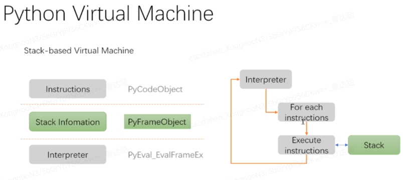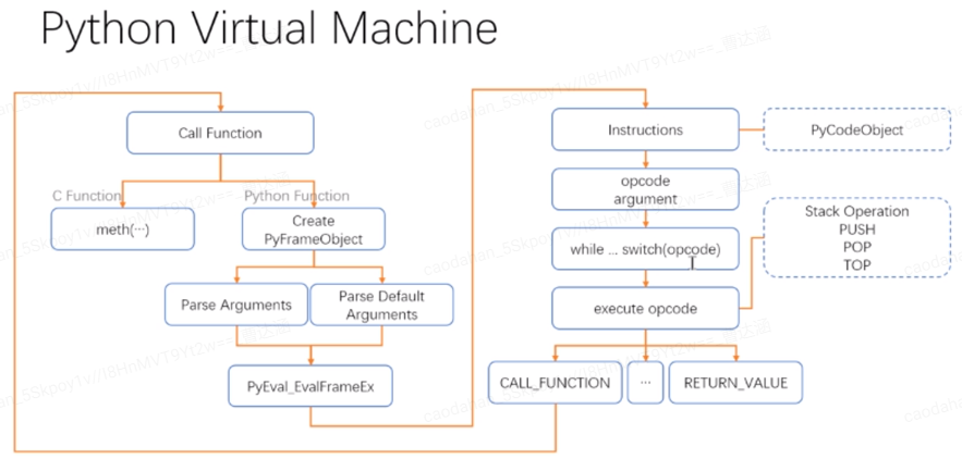 VM通过调度算法在多个线程上切换,最后进入PyEval_EvalFramEx函数,它的作用是foreach instructions : switch opcode,一条一条执行,类似CPU执行指令的过程