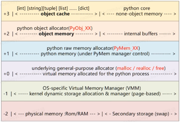 - 一般来说,Python中大量采用了内存对象池的技术,使用这种技术避免频繁地申请和释放内存空间。因此在析构时,通常都是将对象占用的空间归还到内存池中。这一点在接下来对 Python 内建对象的实现中可以看得一清二楚