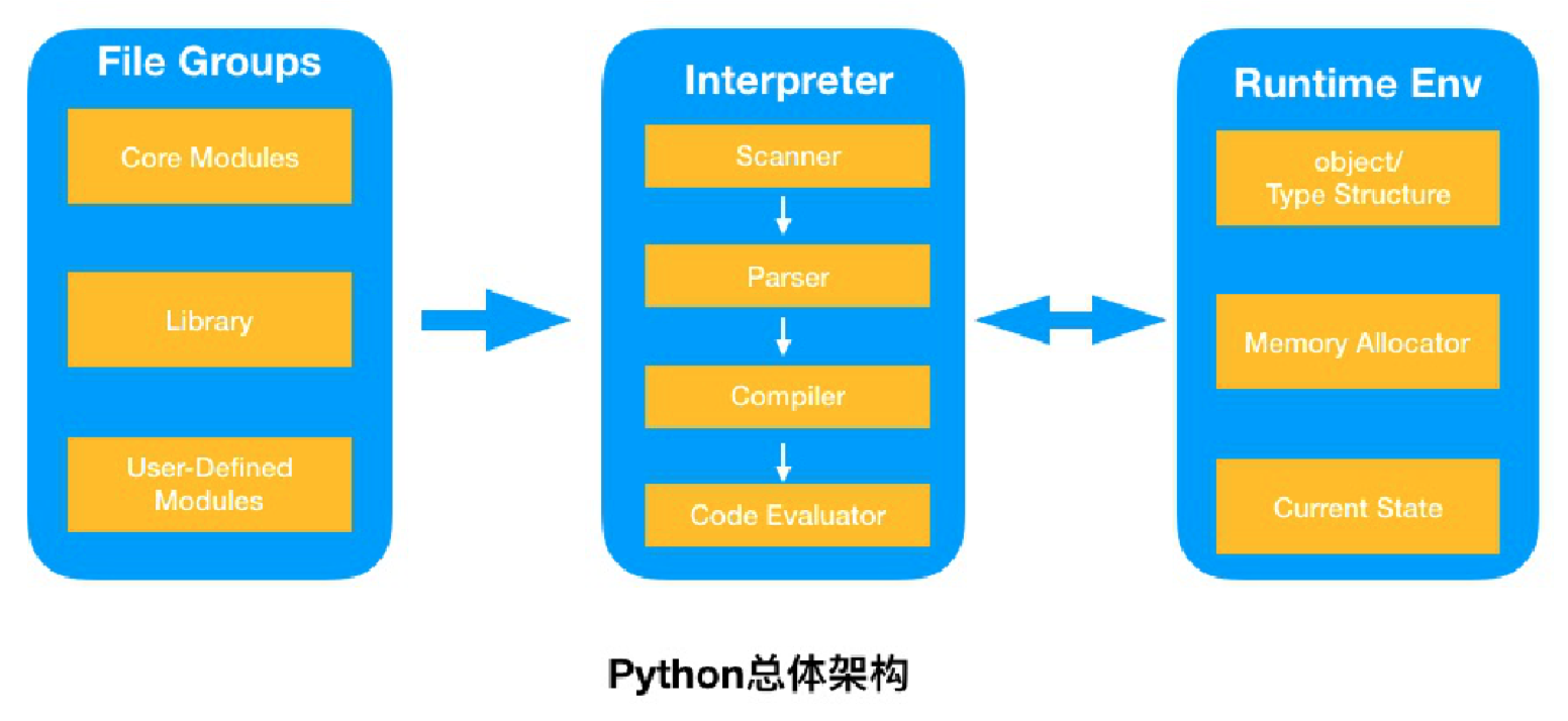 Python是基于C实现的,主要是用C的结构体(struct)。包括库和模块、解释器和虚拟机几个部分: