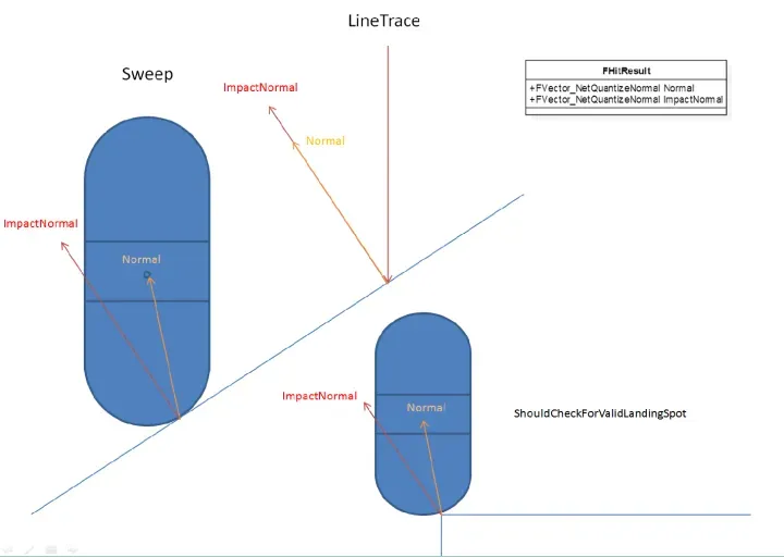 这里还有一些小的细节,比如我们在寻找地面的时候,只考虑脚下位置附近的,而忽略掉腰部附近的物体;Sweep用的是胶囊体而不是射线检测,方便处理斜面移动,计算可站立半径等(参考图3-3,HitResult里面的Normal与ImpactNormal在胶囊体Sweep检测时不一定相同)。