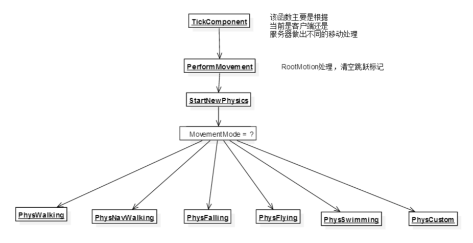 - 调用 StartNewPhysics ,它根据角色使用的移动模式选择 Phys* 函数。