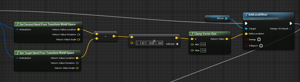 原理:在OnPreGripUpdateEvent事件里 GetDesiredHandPoseTransformWorldSpace(控制器位置)- GetTargetHandPoseTransformWorldSpace(手部模型当前位置)= 控制器输入的偏移值